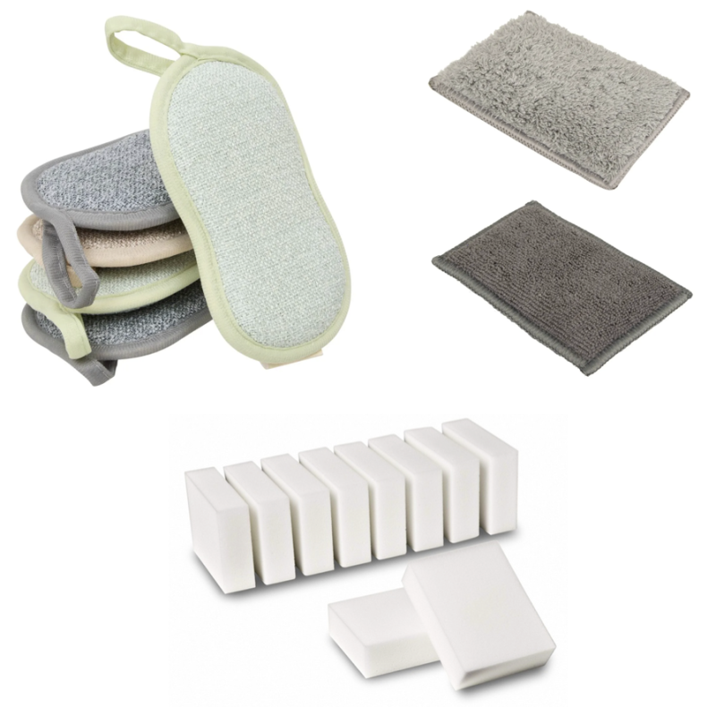 Entretien facile : les éponges microfibre sont lavables en machine, les éponges magiques s’utilisent simplement avec de l’eau.